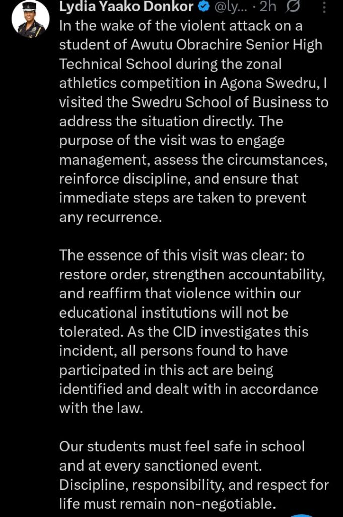 In a recent post sighted on X, the Director-General of the Criminal Investigations Department of the Ghana Police Service, Madam Lydia Yaako Donkor, who visited the Swedru School of Business to address the situation, stated that her purpose was to engage management, assess the circumstances, reintroduce discipline, and ensure immediate steps are taken to prevent any recurrence in educational institutions. She emphasized that violence of any form would not be tolerated. She further noted that all persons found to have participated in the act are being identified and would be dealt with in accordance with the law.